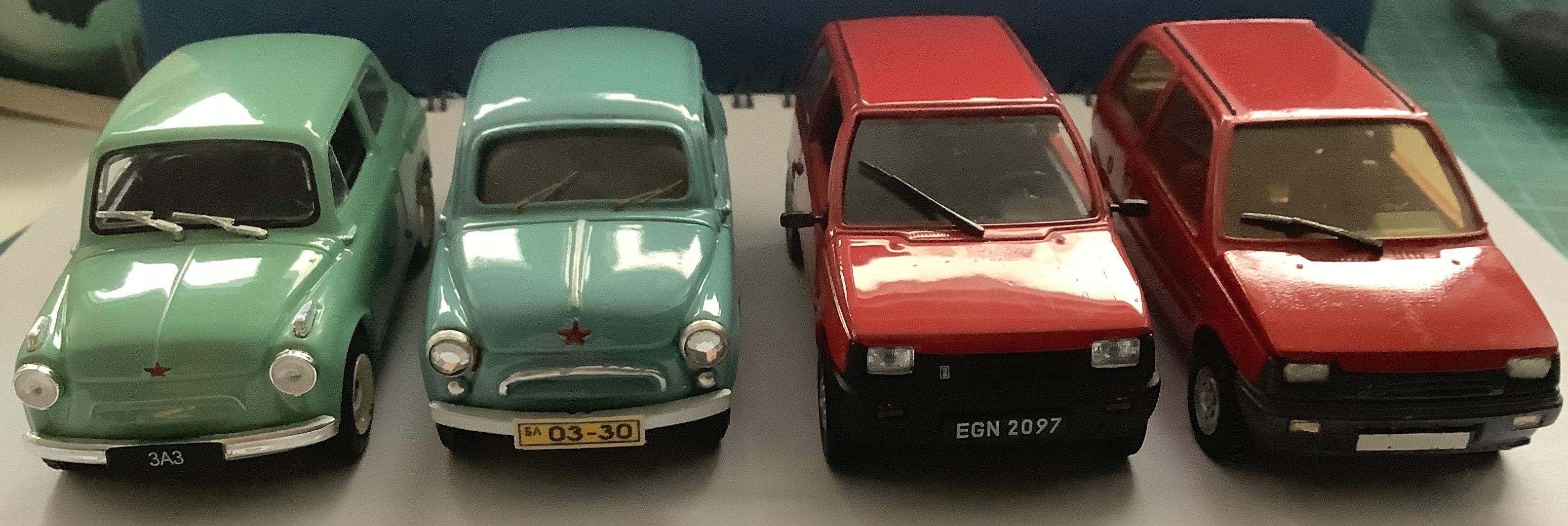 Palun abi pildistatud VAZ OKA ja ZAZ 965 mudelite tootjate tuvastamisel. Minu kogusse jõudsid need aastate eest anonüümsetena, nüüd hakkas asi huvitama, sestap küsingi. Mõlemad 1:43 mõõdus, pole vast hi-tech, aga korralikul tasemel tehtud, eriti OKA, mil lahtikäivad kapott, uksed. Mõlemad plastikust (vaigust?). ZAZi rattad käivad ringi, OKAl mitte. Mõlemad paistavad olema väike-seeria/väiketootja isendid. OKA-l põhjal Z-le või IA-le sarnane märgistus, oleneb, millist pidi peos autot pöörata. ZAZil aga ei mingit vihjet tootjale. Ahjaa, ZAZil puudus eesmine stange, see sai alumiiniumprofiilist välja saetud, sestap see pole originaal. Pildid lisas. Tänan vihjete eest juba ette.